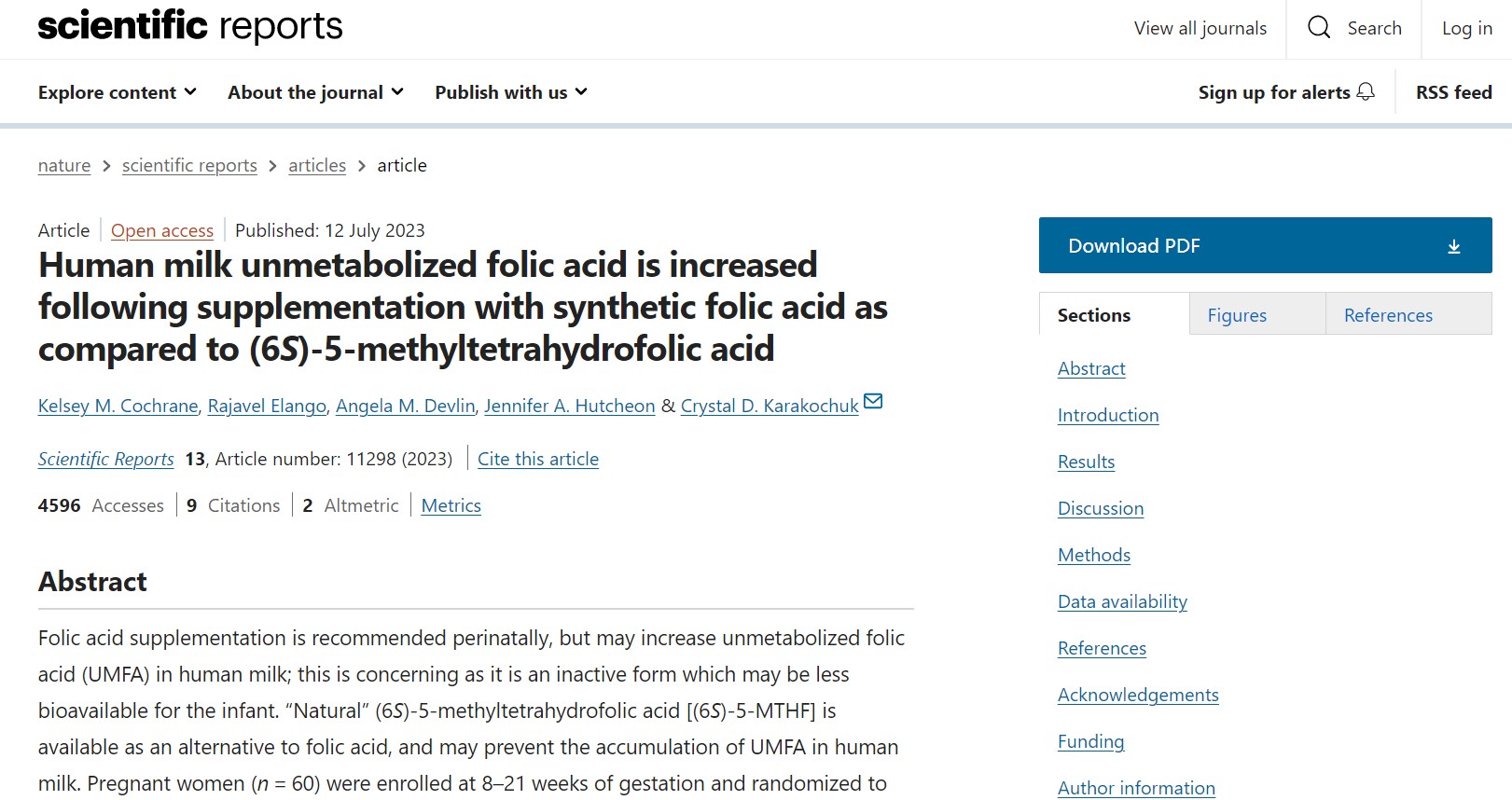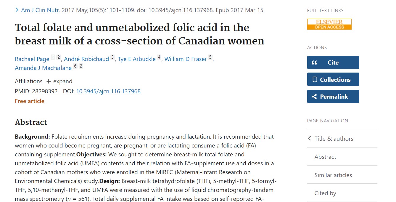 Leathanach R et al. Iomlán folate agus aigéad fólach neamh-mheitibilithe i mbainne cíche mná Cheanada. Am J Clin Nutr 2017; 105: 1101-9.