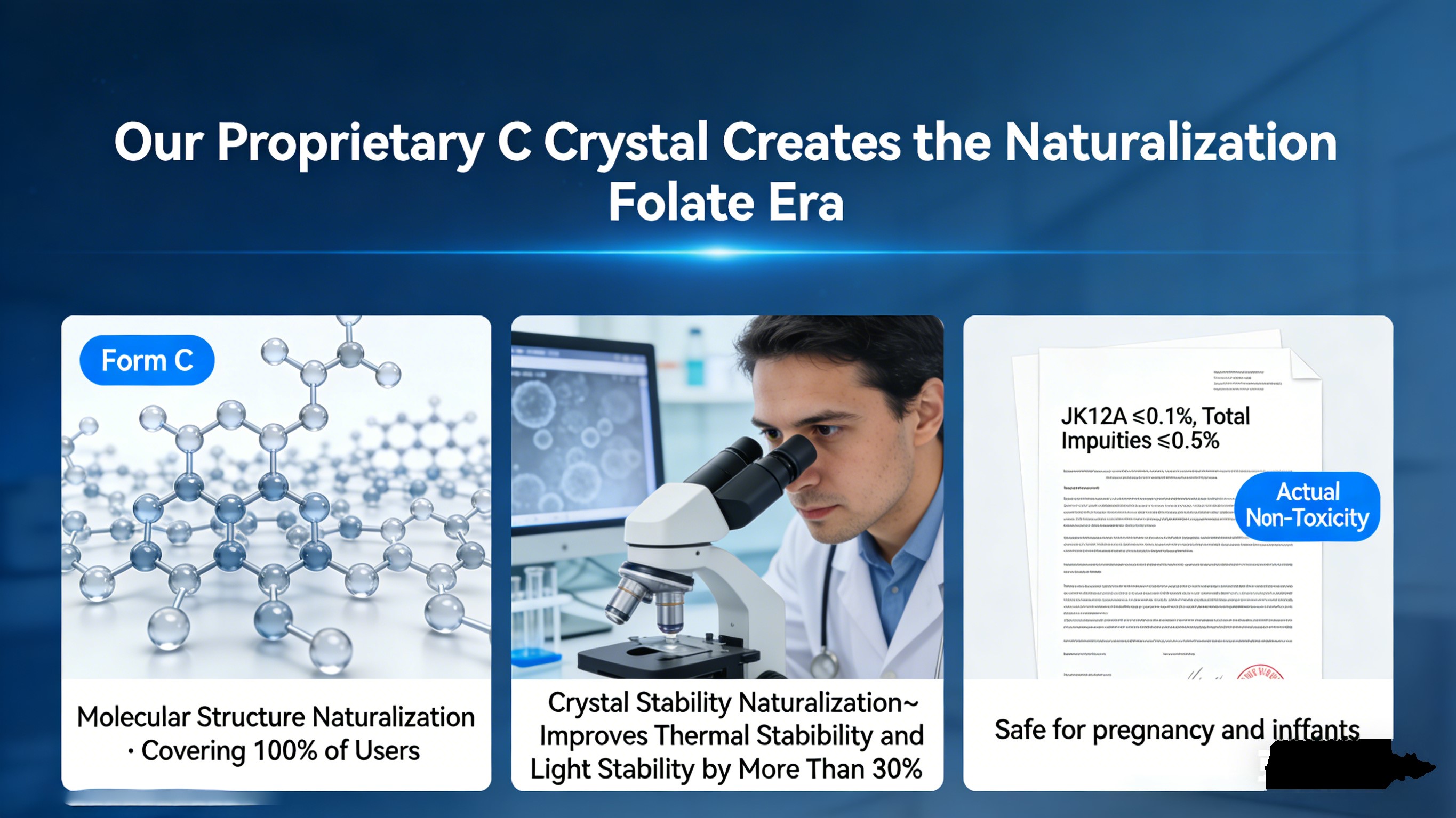Buntáiste lárnach folate gníomhach: a mhóilíneach an struchtúr atá ag teacht le comhpháirt ghníomhach folate nádúrtha, rud a éilíonn uimh tiontú meitibileach agus a bheith in-ionsúite go díreach — oiriúnach do chách daonraí, lena n-áirítear iad siúd a bhfuil neamhoird meitibileachta folate orthu.