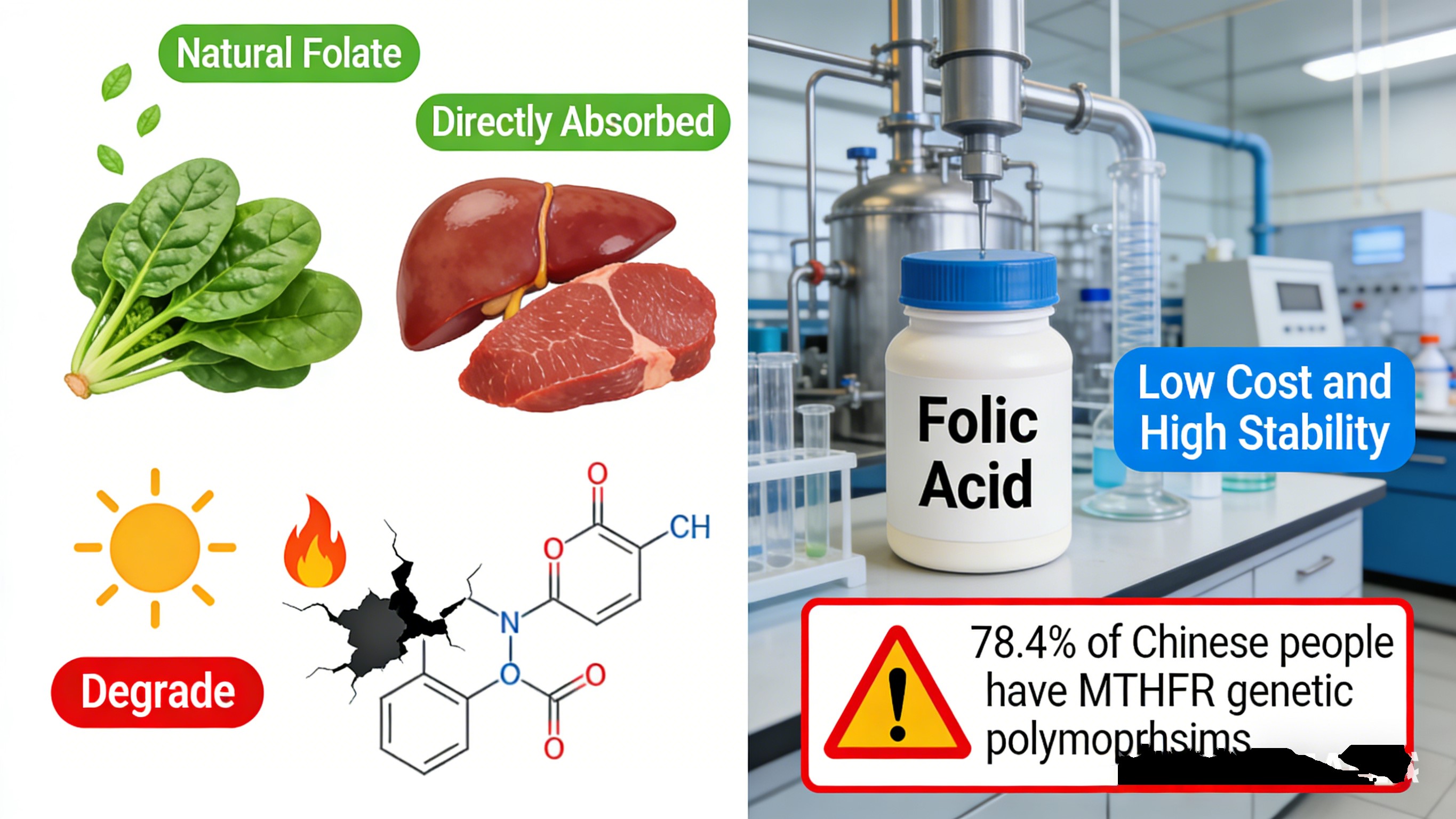 Aigéad Fólach: Folate sintéiseach ocsaídithe. Costas íseal agus an-cobhsaí, ach neamhghníomhach go bitheolaíoch go dtí go n-iompaíonn einsímí daonna iad. 78.4% de na Síne Léiríonn daoine polymorphisms i ngéinte a bhaineann leis an cosán meitibileach.